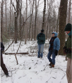 At 11:00 AM a hearty band gathered at the U.S. Forest Service Work Center at Buffalo Gap – RoxAnna, Gretchen, Dwayne, Pat, Judi, Kathy, Carl, and Tom – to meet up with state forester Patti Nylander for a primer on tree identification during the leafless winter months. Patti pointed out various characteristics such as size/shape of the tree, bark form and coloration, branch alignment, and even smell to help identify trees commonly found in Shenandoah Valley woodlands. Some like the shagbark hickory (pictured), white oak, and evergreens such as hemlock are easy to identify. It can be more difficult to distinguish between others, for example the scarlet and black oaks.