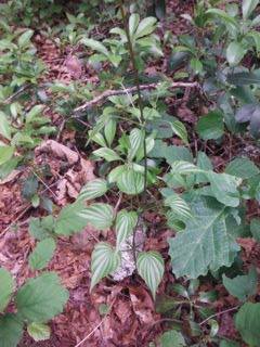 On the theme of things edible, we also came across a new favorite of ours – Wild Yamroot of the Yam Family. This interesting plant starts as a self-supporting plant with unique, heart-shaped leaves palmately veined connected to the main stem in a whorled fashion but then grows into a vine with the leaves appearing in alternate fashion. This particularly species is D. quaternata, the southern relative of the Dioscorea villosa described by Newcomb. A quick online search (http://mason.gmu.edu/~sy/projects/plant/plant.htm) revealed a more interesting use history of wild yamroot (in particular the D. villosa species) as medicinal for menstrual cramps by Native peoples. Despite its common sounding name, eating the root raw will induce vomiting. Note the subtle flowers.