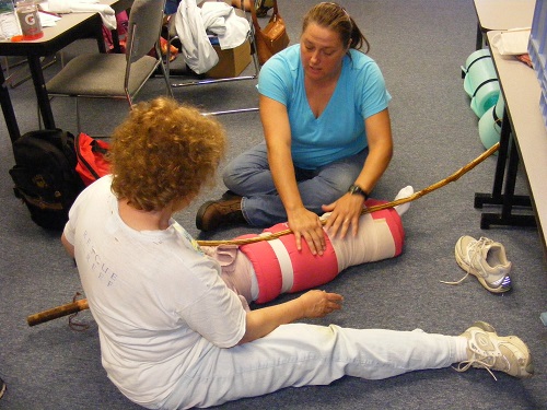 Making that difference is what we worked on the weekend of June 28/29. It surprised me how clear it became, when faced with a simple beginning scenario, how unprepared I was. We learned how to assess the situation for safety, how to safeguard ourselves and then how to address primary and secondary patient assessment using simple mnemonics and acronyms. Using “at hand” materials we practiced splinting, bandaging and dealing with shock, hypothermia, heat exhaustion and heat stroke among other conditions such as insect bites, snakebites, allergies and anaphylaxis. It was a lot of information to assimilate but it was thoroughly engaging and we felt fully supported by the teaching team of Brad and Paula. They watched us closely and listening to our questions responded with thoughtful care and whatever detail we needed. The practice scenarios were both inside and outside and we got pretty darn creative with them. My comfort level increased and I moved from “frozen” to decisive.