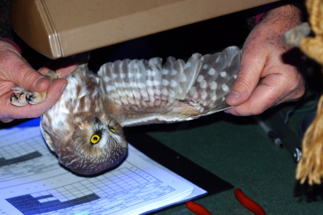 The capture data sheet is used to record specifics about captured owls. This female was previously banded about two weeks prior to its recapture. Body weight and size as determined by wing length are the manner by which sex is determined, the females being larger than the males.