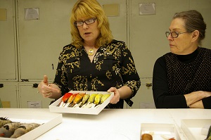 After lunch in the cafeteria we rejoined Christina, who took us into the Division of Birds. There she had carefully laid out a display of interesting, historic, colorful and some not-so colorful specimens for us to examine. We saw color variations of flickers from west to east as well as color variations of scarlet tanagers due to age and sex.