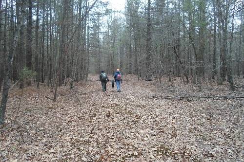 Natural Heritage Stewards Ryan Knopf and Wes Paulos carry out a tire dumped in the Deep Run Ponds Preserve during a HMN Projects Committee trip there in February 2014.
