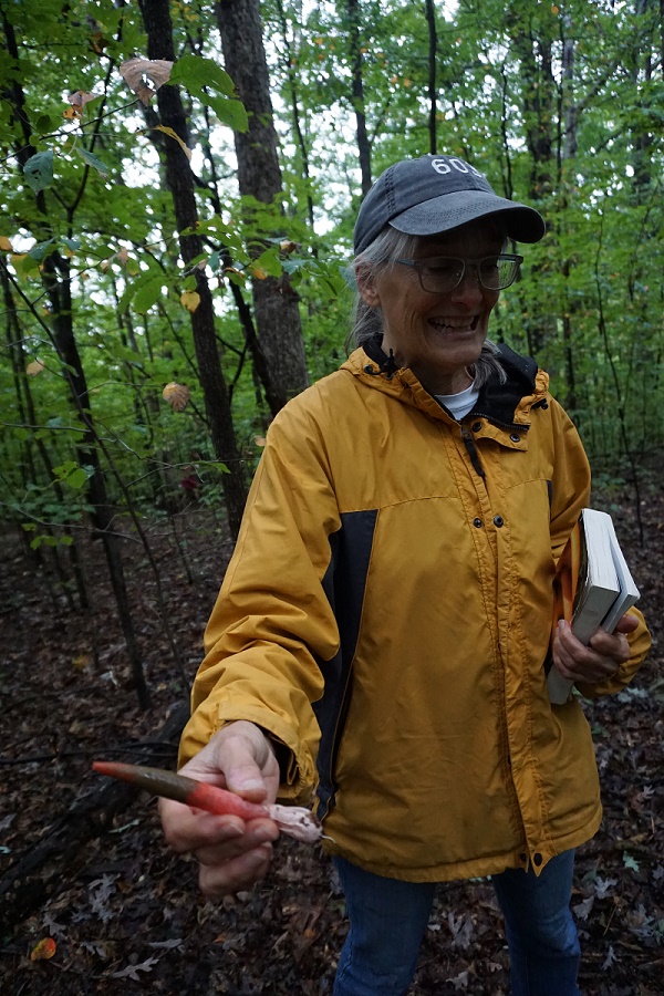 elegantstinkhorn.Peggy.cb.9.23.18 Published September 30, 2018 at 600 × 900 in Rain = Mushrooms! ← Previous Next → Peggy with an elegant stinkhorn. Photo by Chip Brown.