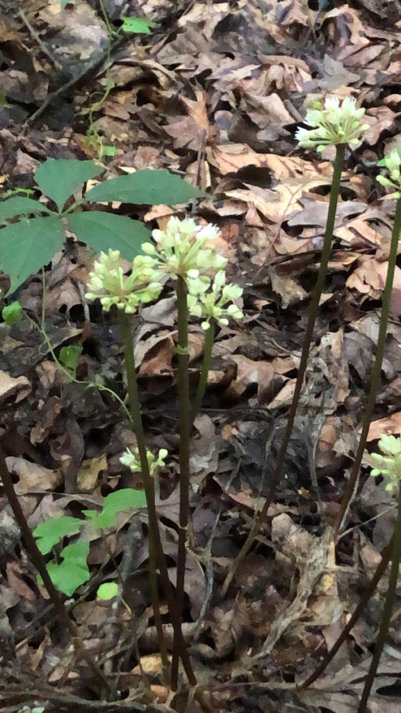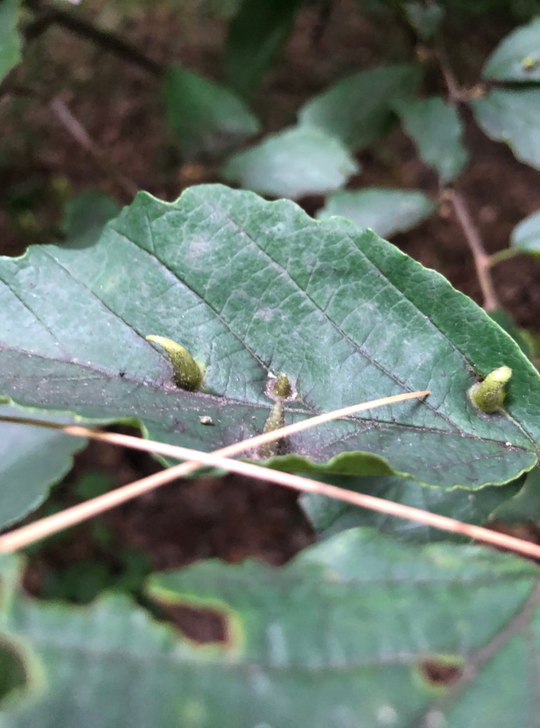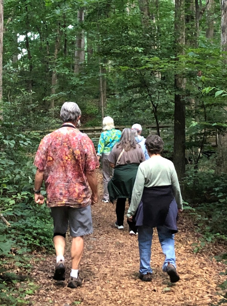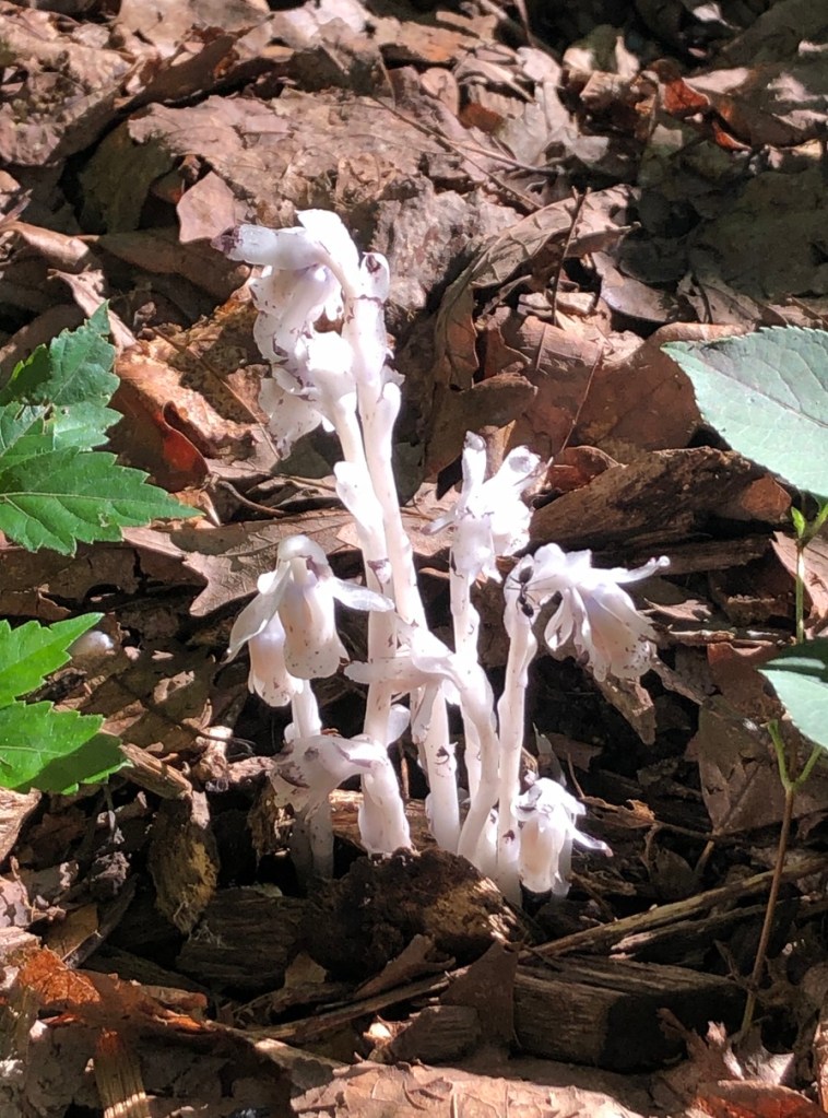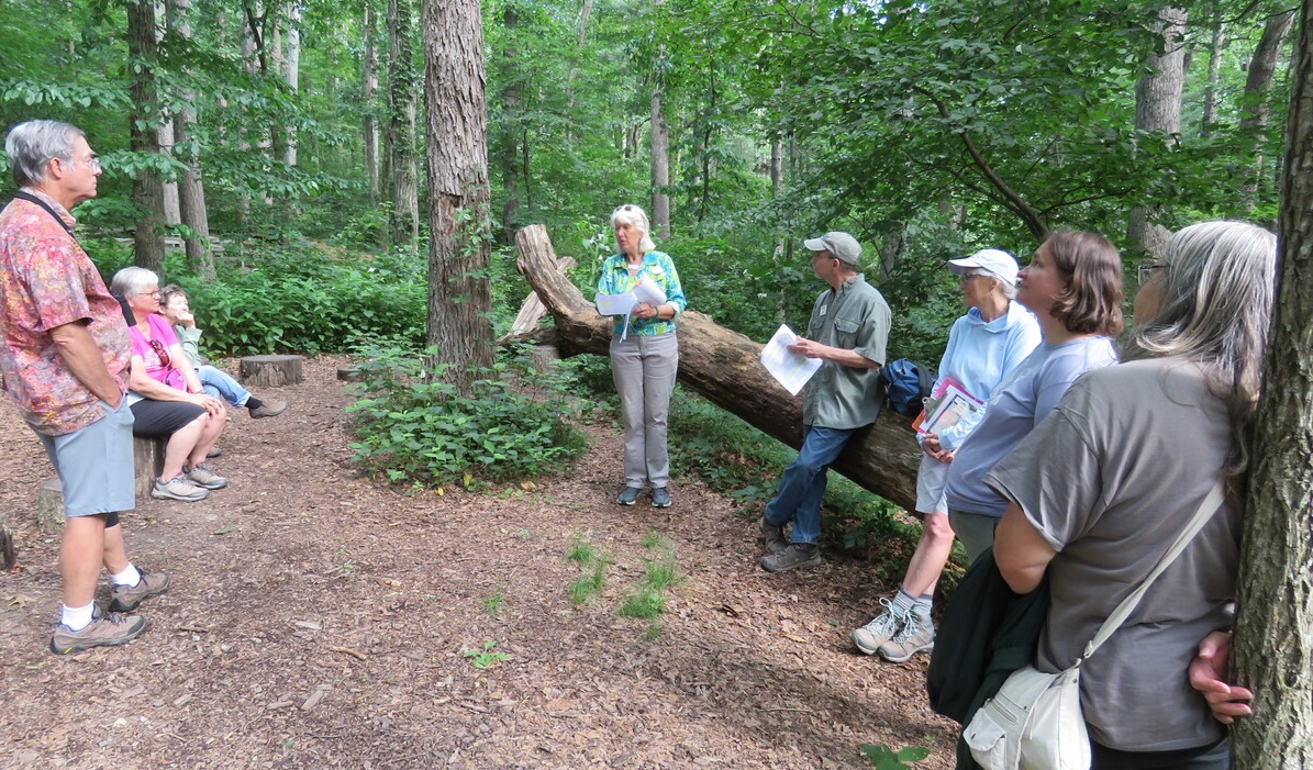 On the beautiful, cool, crispy, evening of June 15, Dave Forrer and Jan Mahon, Arboretum Director, took us (Peggy and six of the trainees) on a tour of James Madison University’s Edith J Carrier Arboretum. Jan first told us of the worth of the tree & plant communities in the arboretum and how it has grown from 26 to 125 acres since its opening in 1989. Dave then led us on various trails, pointing out many trees and how the now mainly Oak-Hickory forest was once Oak-Chestnut. We did find a 15 ft American Chestnut trying to buck the odds. We kept our eyes low too, finding spectacular examples of Indian pipe, coral fungi, Oakleaf Hydrangea, Wild Ginger, ramps, Witch-hazel (with its Cone Gall Aphid galls which Dave says look like witches’ hats) and so much more.