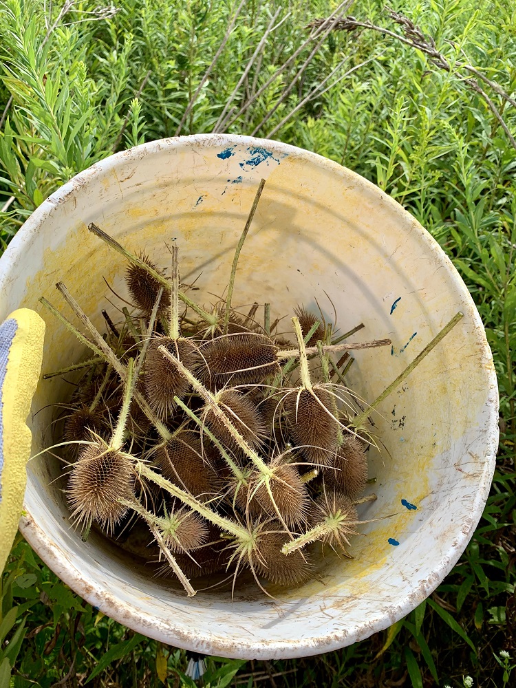 Seven HMNs and a fellow nature enthusiast met Steve at the Cowbane Preserve on Saturday morning, August 14. Its public inaccessibility that helps protect it gave us a bit of a late start, but we made up for it. Equipped with pruning clippers and buckets and (mostly) protected from the briars with long sleeves and pants and gloves, we strode into the fields, along the paths, and around a seasonally wet area where the tall teasel stalks were congregated to remove their seed heads and hopefully prevent this year’s seeds from being sown. As our buckets filled, we emptied them into big black plastic bags provided by Steve for secure disposal.