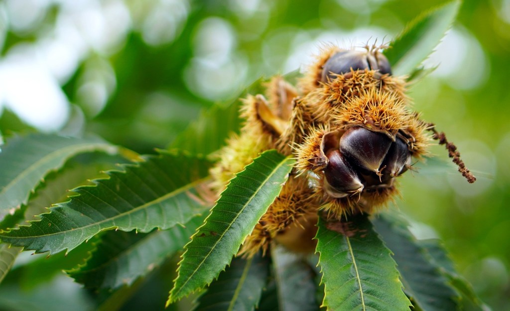 Photo at top is of chestnut leaves and seeds courtesy of Pixabay.com.