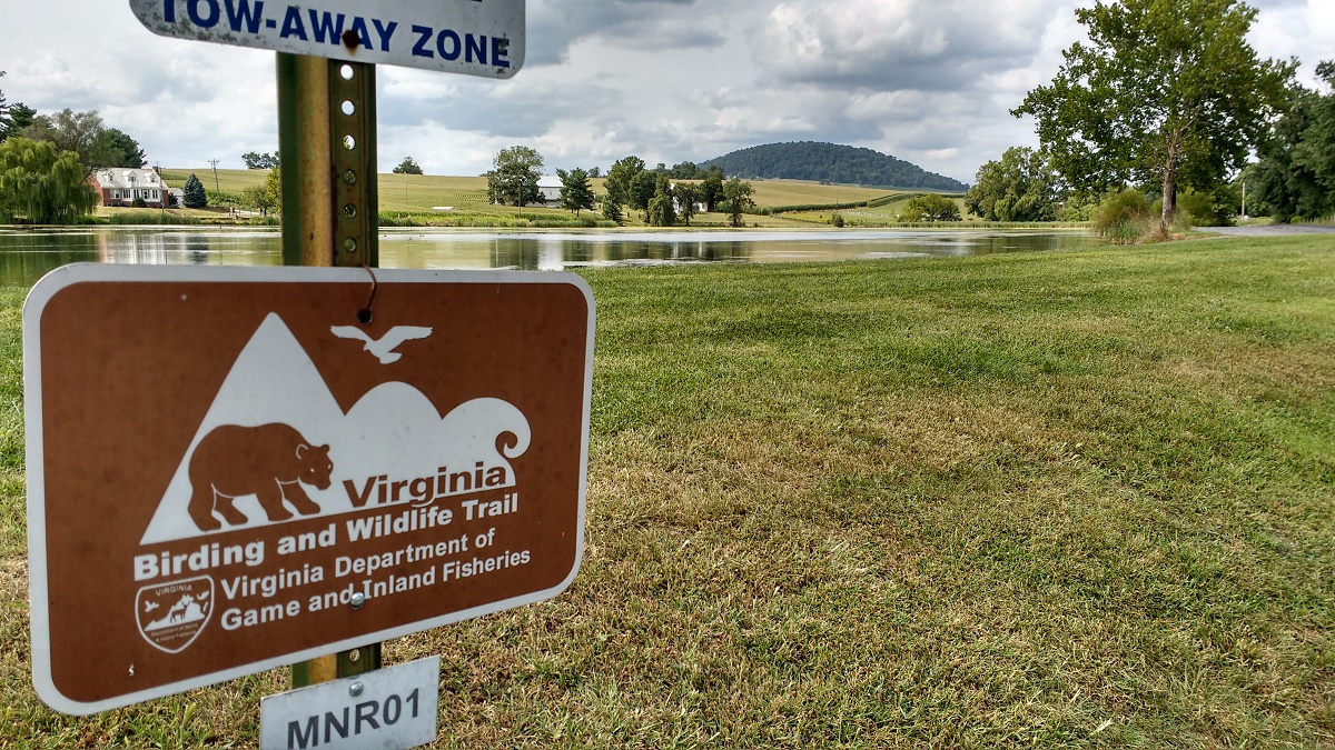 August 2018 photo of the Bird and Wildlife Trail sign at Silver Lake. Since then the Virginia Department of Game and Inland Fisheries has been renamed the VA Department of Wildlife Resources and the Birding and Wildlife Trail program has dropped the “ing” in Birding to become the Bird and Wildlife Trail.