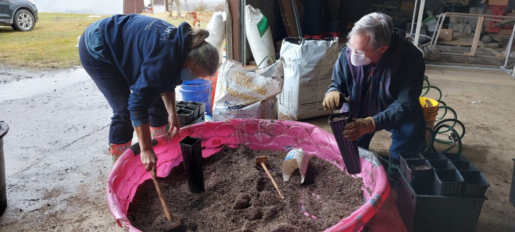 On February 3 and 4, Headwaters Master Naturalist volunteers joined up with Rivanna Chapter VMNs and members of The American Chestnut Foundation (TACF) to sow chestnuts at the Virginia Department of Forestry’s Center in Crimora. The TACF organizers were happily surprised with the total number of volunteers that came: 20 on the 3rd and 15 on the 4th. Representing Headwaters were Karen Milne, John Bauman, Peggy Plass, Tom Engle, Tina Dove, Zack Perdue, Dave Forrer, and Cindy Westley (who has just transferred from the Rivanna Chapter to Headwaters- Welcome, Cindy!). A number of other HMNs had signed up for the 5th (Saturday), but due to the large turnout on Thursday and Friday, there was no work left for Saturday. Thanks (and regrets) to those who signed up for Saturday!