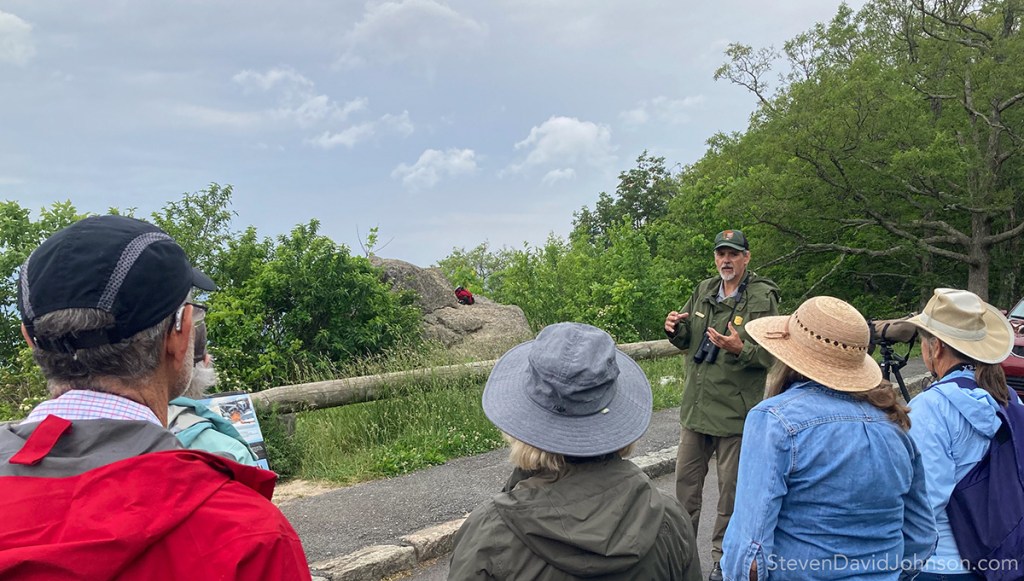 On June 7th, a group of 15 Headwaters Master Naturalists arrived early to Franklin Cliffs (milepost 49) in the Shenandoah National Park to observe four young peregrine falcons and learn about the program that has been taking place annually in the park since 1989. The forecast was for rain and clouds to move into the area, but we were eager enough to beat the weather. In attendance were John Bauman, Kathy Byers, Malcolm Cameron, Lacey Dean, Tina Dove, Pam and Lincoln Gray, Anna Maria and Steven David Johnson, Diane Lepkowski, Kate Mahanes, Ann Murray, Zack Perdue, Peggy Plass and Elaine Smith.