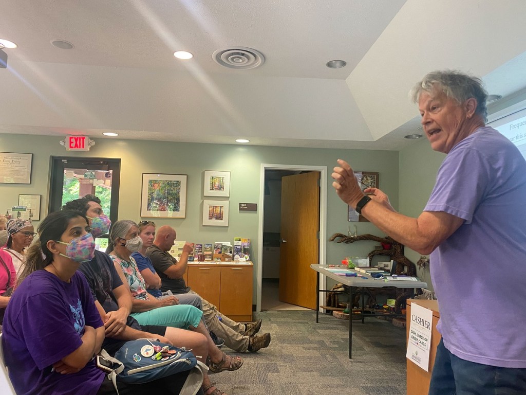 The Brown Bag Lunch series at the Edith J. Carrier Arboretum at James Madison University featured two programs in June presented by Headwaters Master Naturalists. The first, on June 22, was “What Humans Hear in Nature & Vice Versa” presented by Lincoln Gray, who is professor of Communication Sciences and Disorders at JMU. The focus of his talk was a comparison of the hearing anatomy of various species, and how each is adapted to its needs and environment. As might be expected, the sensitivity to sounds of different frequencies varies quite a lot between species. For example, among mammals, cats have the “best” hearing, in that they can hear the widest range of frequencies, whereas pigeons are masters at hearing low frequency sounds; it’s believed that a pigeon perched on the Gateway Arch in St. Louis can hear the rumble of the waves from the Atlantic and the Pacific!