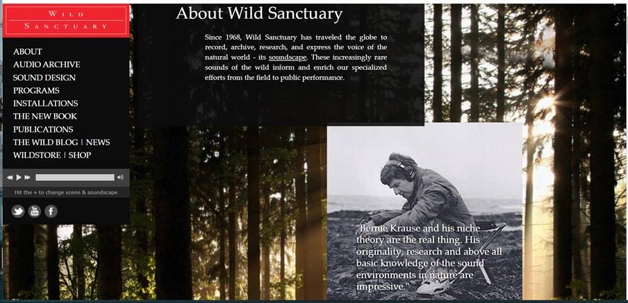 In 1968, Krause founded Wild Sanctuary, an organization dedicated to the recording and archiving of natural soundscapes. This website has so much to explore! The Audio Archive currently has over 4,500 hours of wild soundscapes and more than 15,000 identified life forms. Half of the soundscapes are from habitats that no longer exist, are too radically altered from human endeavor, or have gone silent. There are Sound Design and Audio Art, Workshops, Installations, and many Books and other Media. For example, The Great Animal Orchestra and Voices of the Wild: Animal Songs, Human Din, and the Call to Save Natural Soundscapesare two popular books.