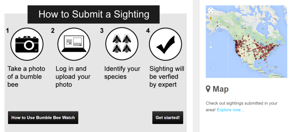 Project Description: Bumble Bee Watch observers make photographs of bumble bees and then upload them, along with contextual data, through the Bumble Bee Watch website or mobile app. Observers identify the bumble bees in the photographs, which are then verified by bumble bee experts. The identifications contributed by citizen scientist volunteers help researchers determine the status and conservation needs of bumble bees, and in some cases, help locate rare or endangered populations of bumble bees. Through their participation, citizen scientist volunteers learn about bumble bees, their ecology, and ongoing conservation efforts.