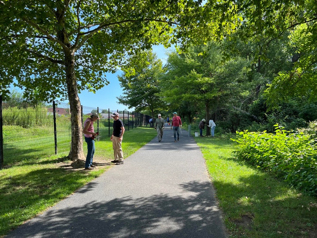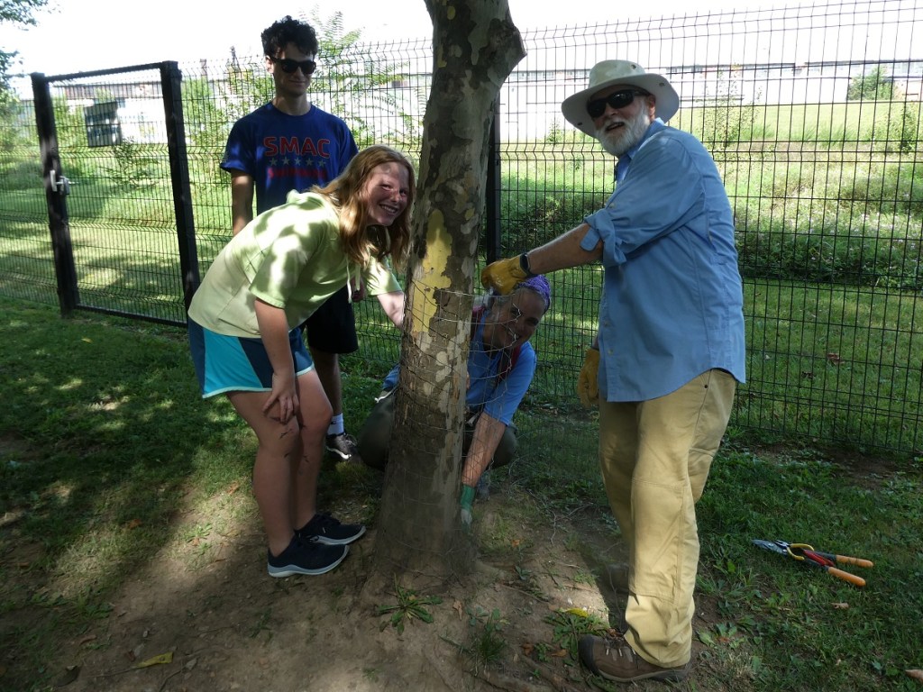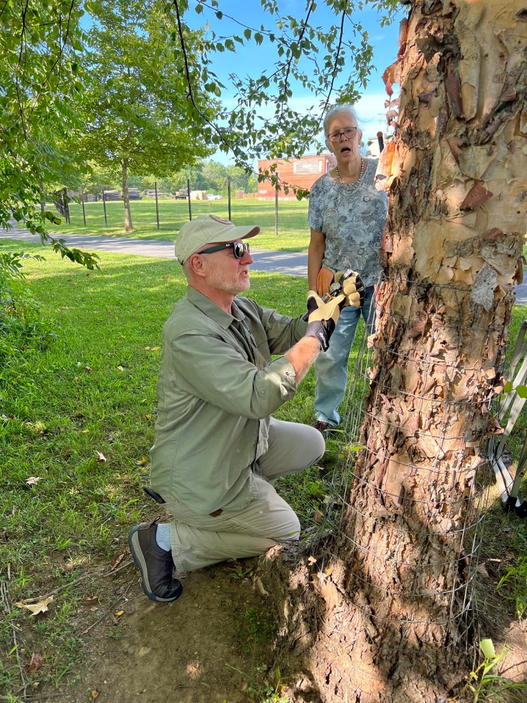 On Saturday, August 12, Headwaters Master Naturalists and Charlottesville Area Tree Stewards (CATS) joined forces in Waynesboro to replace beaver cages around planted trees along the Greenway. The shaded path and breeze down by the river and enthusiasm all around made for a perfect workday.