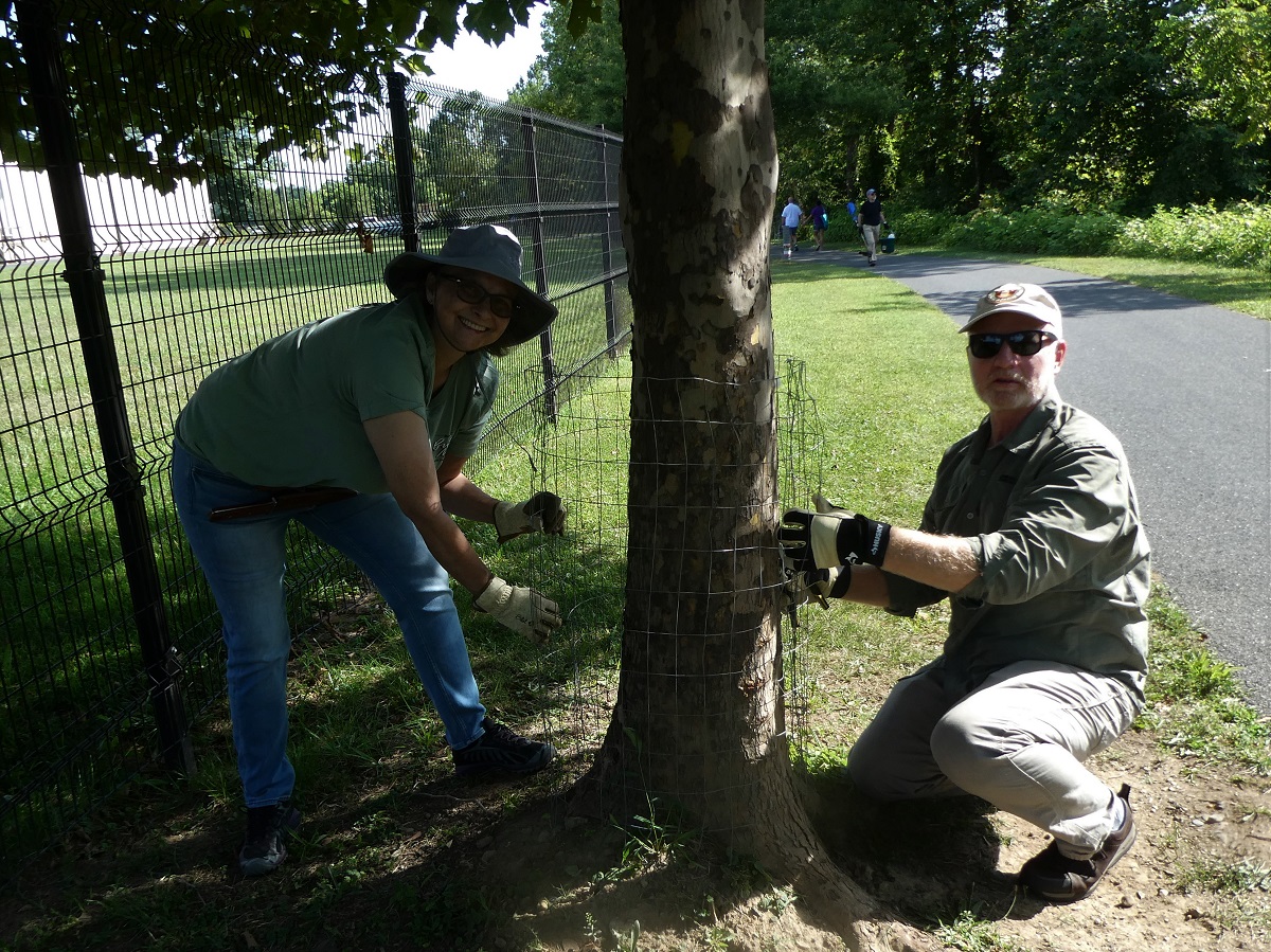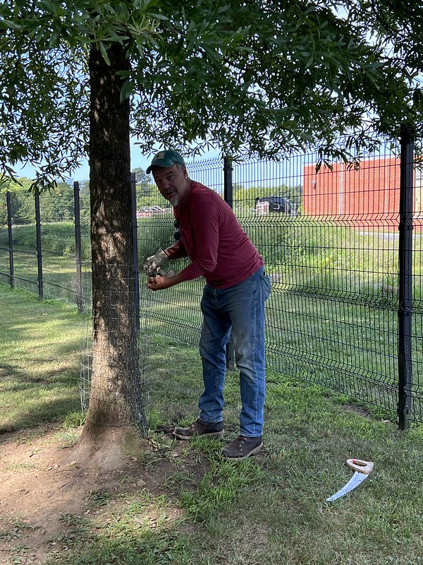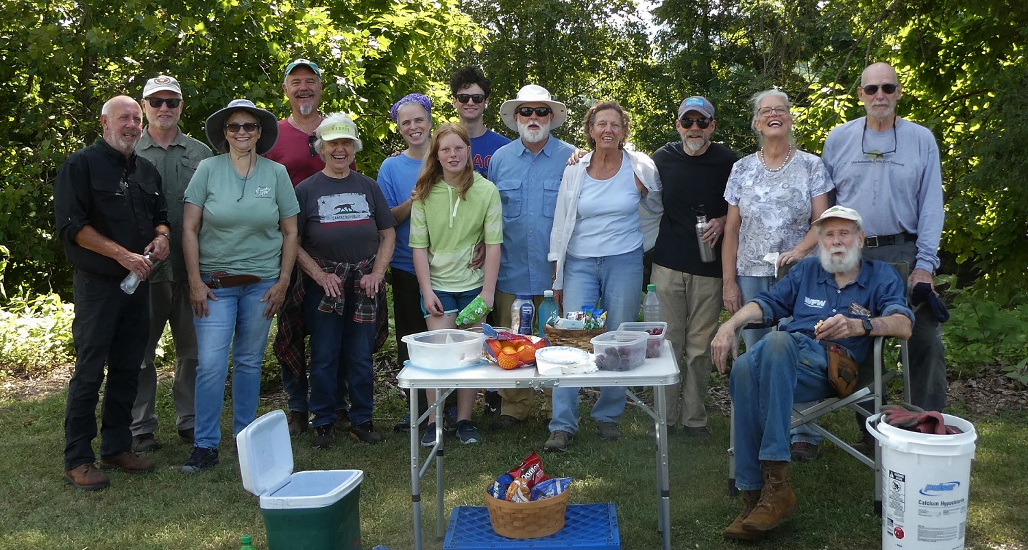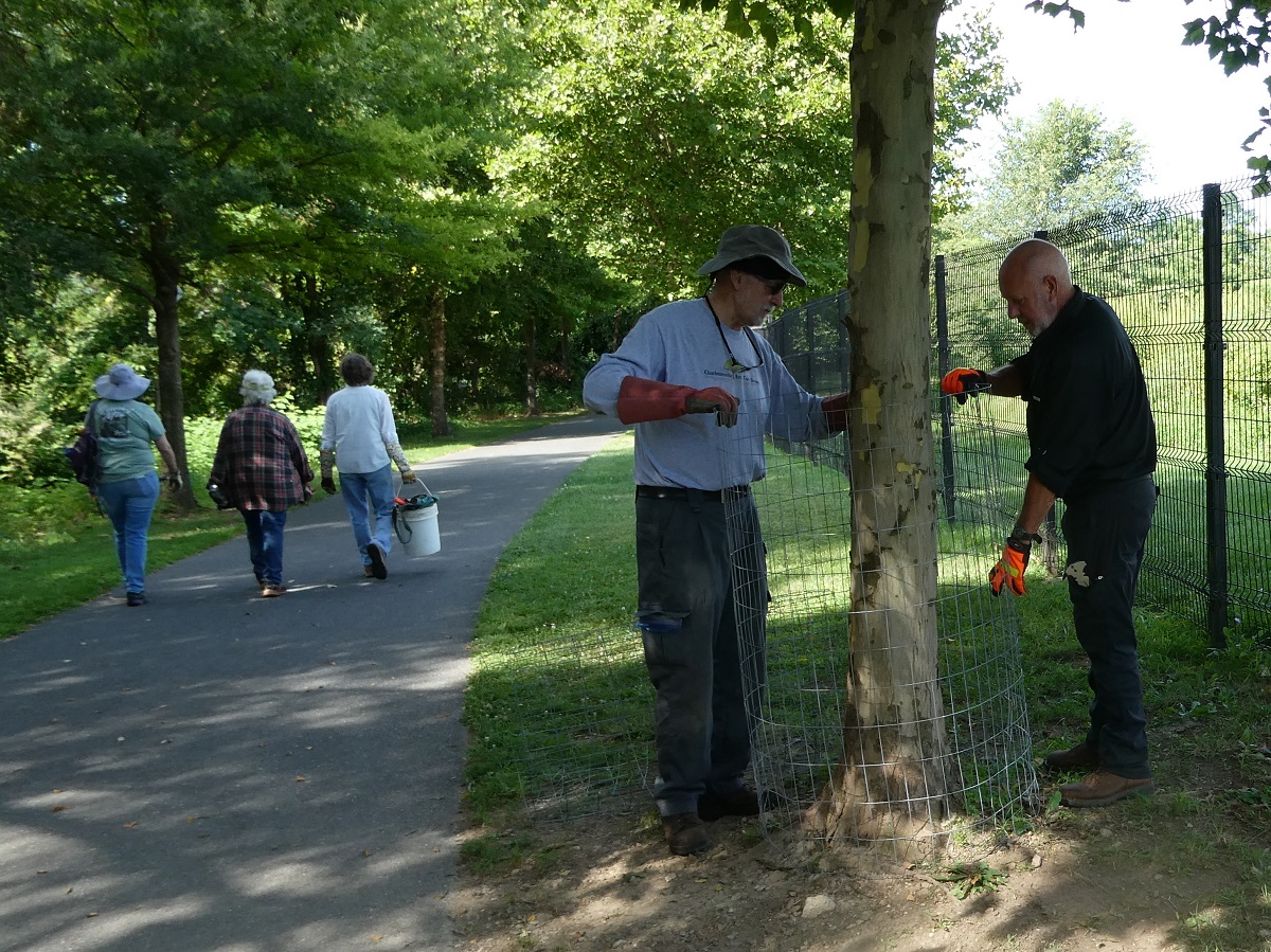 On Saturday, August 12, Headwaters Master Naturalists and Charlottesville Area Tree Stewards (CATS) joined forces in Waynesboro to replace beaver cages around planted trees along the Greenway. The shaded path and breeze down by the river and enthusiasm all around made for a perfect workday.