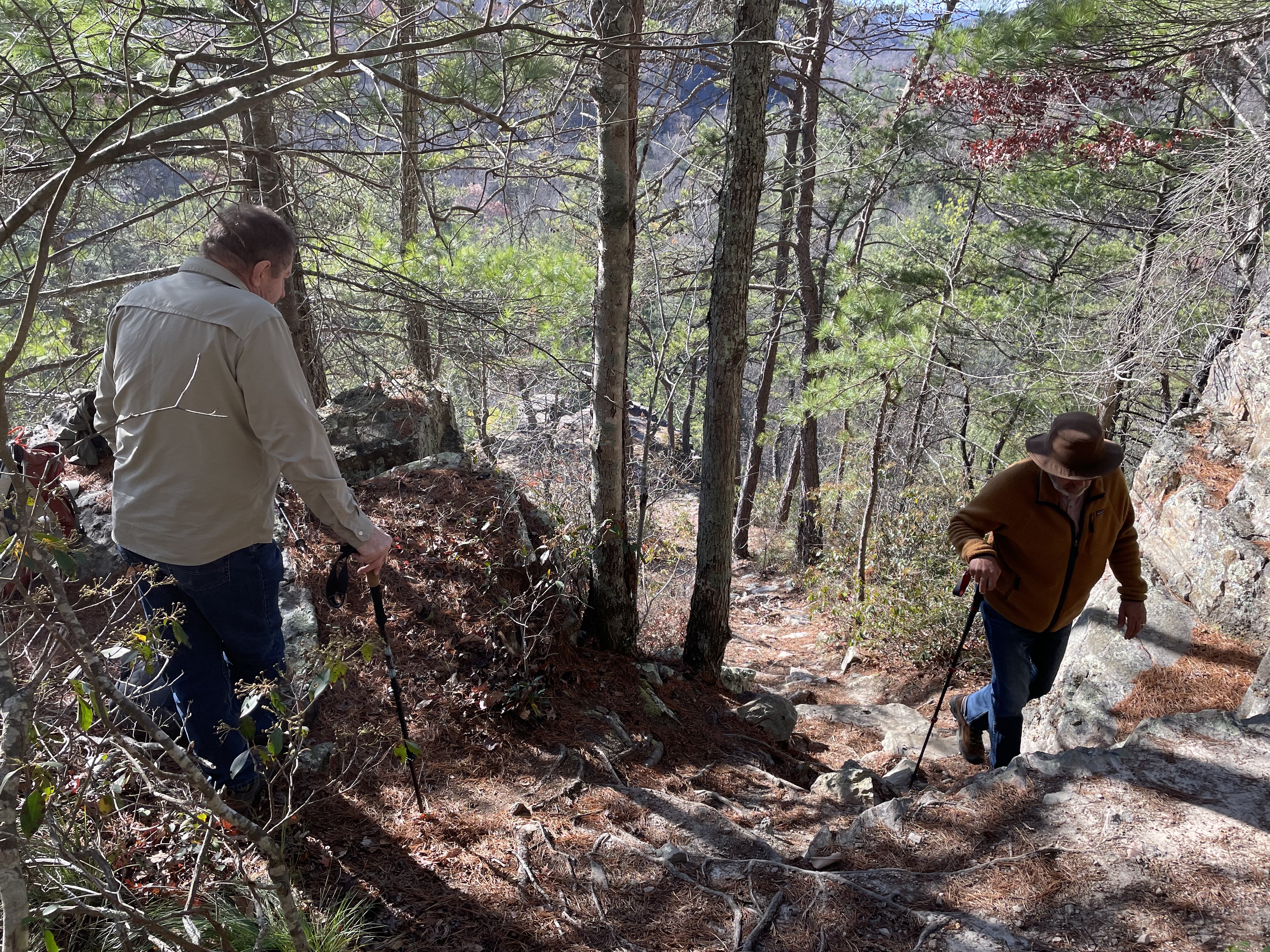 Just above the overlook of North River Gorge, Gary Flynn and Bill Howe walking up from the sandstone outcrop. Photo by Malcolm.