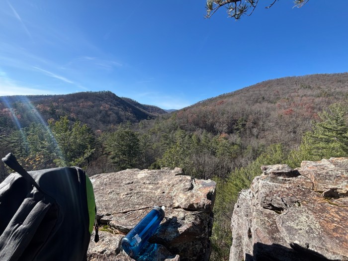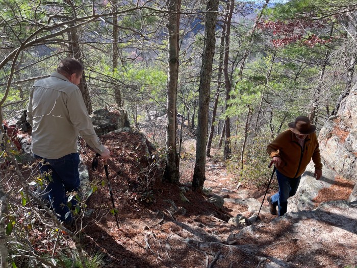 From the Lookout Mountain Trail overlook, we enjoyed lunch with views of sandstone and quartzite cliffs along North River Gorge. In the distance are Trimble Mountain (right) and Elkhorn Mountain (left). Photo by Larry Ragland.