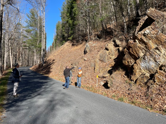 On Thursday, November 13, a beautiful fall day, two other HMN members and three friends joined me in Stokesville for a tour of notable rock outcrops in the Stokesville, North River Gorge, and Staunton Dam areas. The tour focused on the two most common rock formations in the North River Ranger District of the George Washington National Forest, as well as the four mountain-building events that created the high source lands to the east and the extensive erosion that shaped the Blue Ridge, Shenandoah Valley, and Allegheny regions over millions of years.