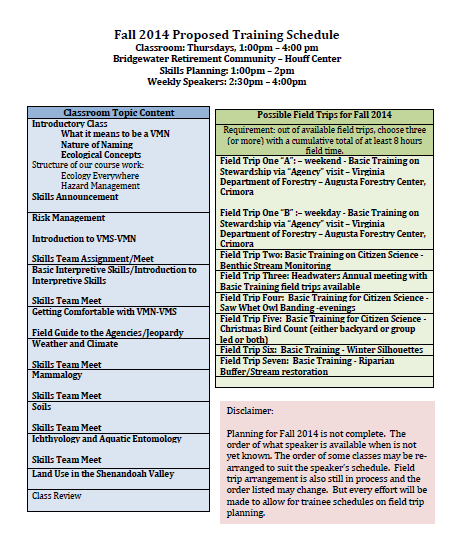Proposed Fall 2014 Published June 20, 2014 at 460 × 556 in Become a Virginia Master Naturalist! ← Previous Next → Click on this image for a sample fall schedule. Like Loading...