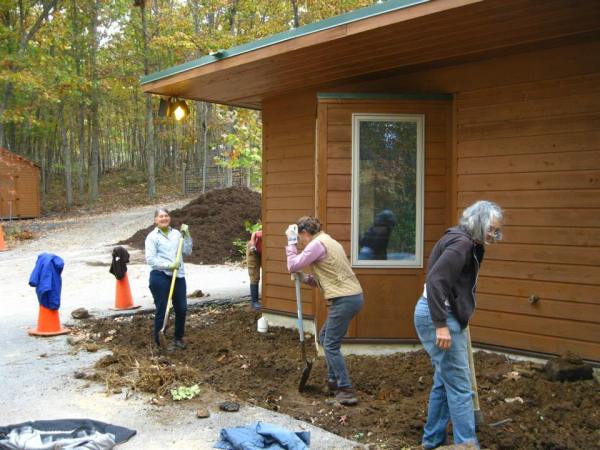 Photograph of HMN and other volunteers working on the 2013-2014 HMN Focus Project, a new certified Wildlife Habitat at the Wildlife Center of Virginia in Waynesboro, Virginia, 2013
