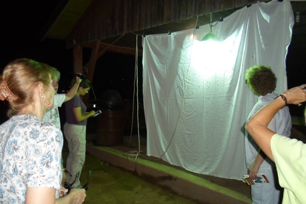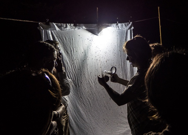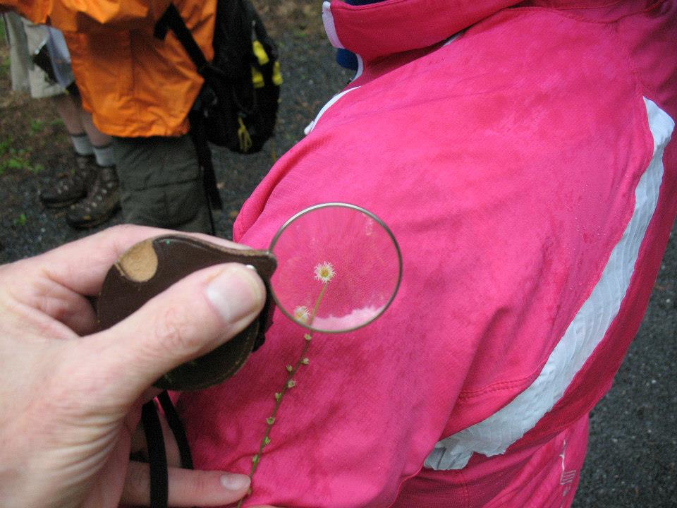 Photograph of insect viewers at an unofficial entomology event after the Bug Dance was postponed due to weather 22 August 2014