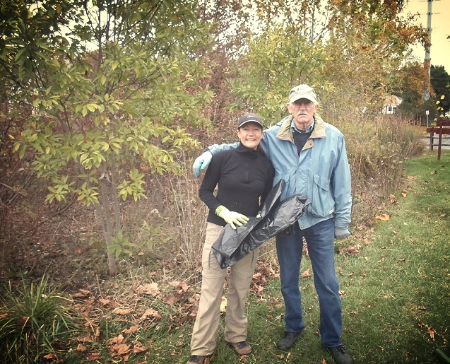 Adrie Voors photograph of Art Vasy and Kathy Byers weeding invasive plants and removing tennis balls from the rain garden at Purcell Park in Harrisonburg, Va Autumn 2014