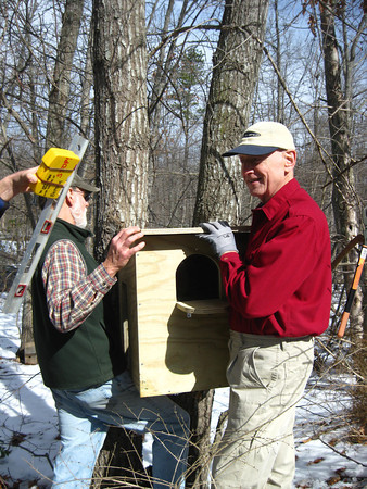 Photograph of hanging the Barred Owl box during a workday for the 2013-2014 HMN Focus Project, a new certified Wildlife Habitat at the Wildlife Center of Virginia in Waynesboro, Virginia, 8 March 2014