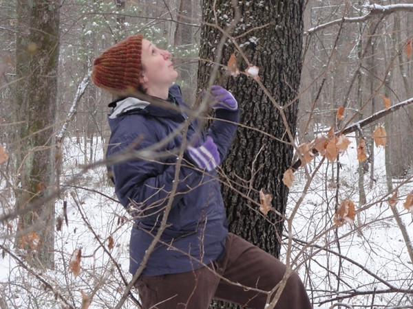 Tom Long photograph of VDOF Senior Area Forester Patti Nylander teaching winter tree identification at a HMN trip to VA Department of Forestry Buffalo Gap workstation, February 2014