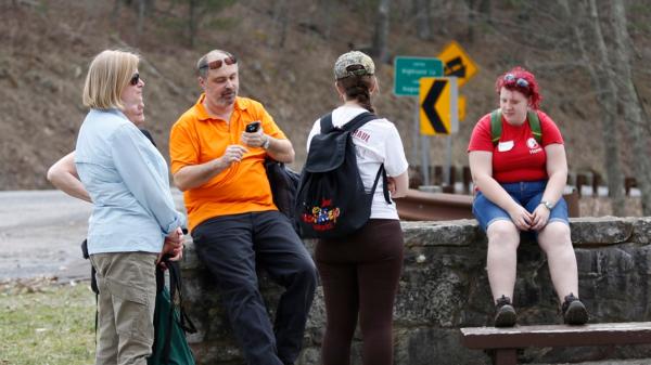 Collage of April 2017 HMN photographsDeb Pugh photograph of Jan Worthy on the porch of Buckhorn Inn 25 March 2017Deb Pugh photograph of Kate Guenther and Brian Lux on Training Class field trip 25 March 2017Gibbous moon on night sky hike 8 March 2017Peggy Plass photograph of tree planting at Marl Creek Trail March 2017Peggy Plass photo of Kristina Oates and guide Daniel Greenawalt at cave entrance 21 March 2017 Adrie Voors photograph of Purcell Park hops pull volunteer project 24 Feb 2017Sandy Greene photo of Margaret Speicher demonstrating use of internet tools for naturalists 21 Jan 2017