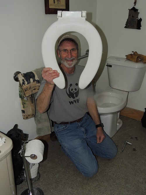 Someone asked me to explain the photo of me that was taken at the last HMN Focus Project workday at the Wildlife Center of Virginia (WCV). The photo, which I assume will appear with this story, shows me with a frame (some say a “halo”) around my face as I kneel on the floor of the unisex restroom at the WCV. Angel Cooper, who is on the Focus Project Pond Team asked me if I could install a new toilet seat in the restroom. (I guess she thought it was “pond-related”.) Of course I said “Yes”, but after removing the old seat I found that the new seat had a different attachment system. Well, Angel caught me with her camera as I was trying to determine how to proceed. Obviously, she found me immersed in my work and now I expect to be the butt of many jokes in the future. Of course, you’ll have to admit, I did get to the seat of the problem.